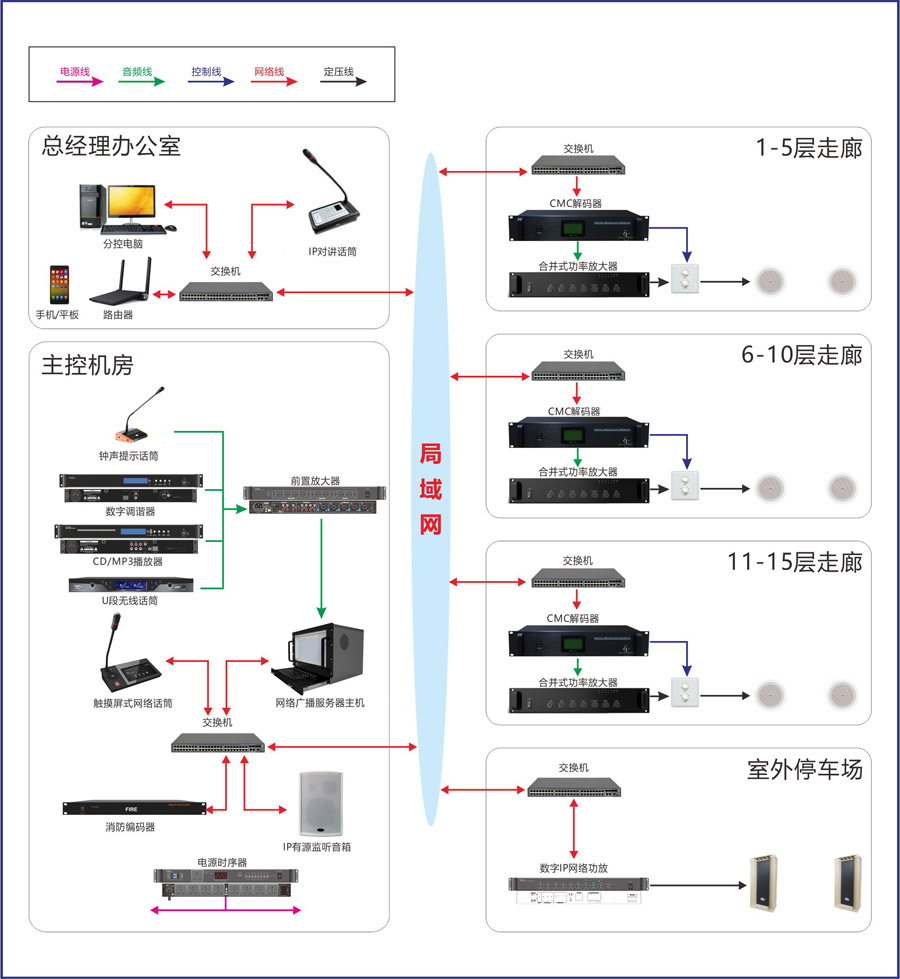 4、同一時(shí)間不同區(qū)域不同內(nèi)容的直播/廣播—— 通過控制軟件的設(shè)定,可實(shí)現(xiàn)同一時(shí)間對不同的區(qū)域播放不同的內(nèi)容,如:不同樓層同時(shí)進(jìn)行不同內(nèi)容的語音擴(kuò)聲